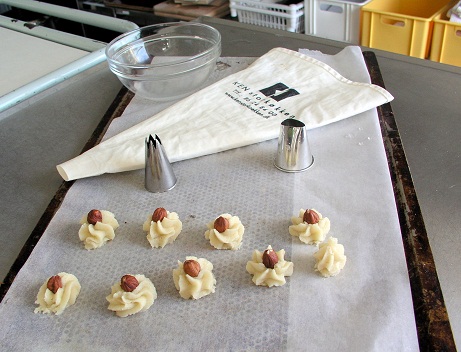 Hæld nu kransekagemassen i en solid sprøjtepose og sæt den tylle på, som skal bruges. På billedet ses de to tyller, jeg brugte. En stjernetylle og en kransekagetylle. Sprøjt ud på bagepapir.
