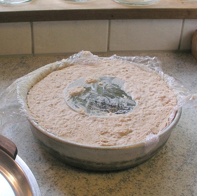 Smag til med citronsaft og salt og kom i en randform som er beklædt med film indvendigt (se billede).