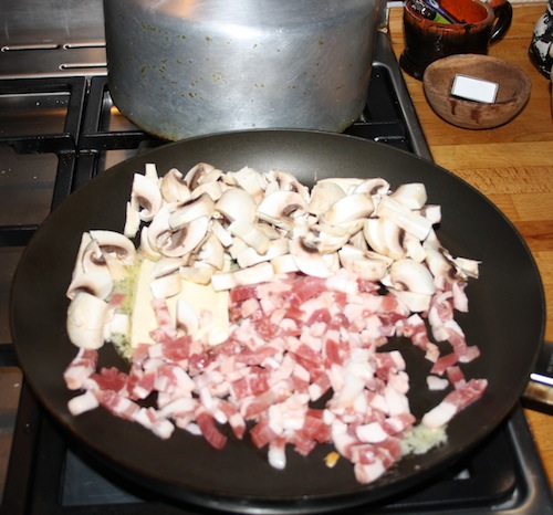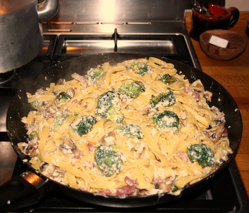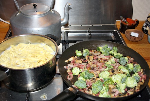 Kog pastaen og lad den ligge i vandet til den skal bruges. Skær champignon i skiver og brun sammen med løg og bacontern. Del brocolli i små “buketter” og brun med det sidste minut.