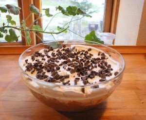 Tilsidst kommes flødeskum, af de 4 dl. piskefløde, på og der pyntes med chokoladespåner.