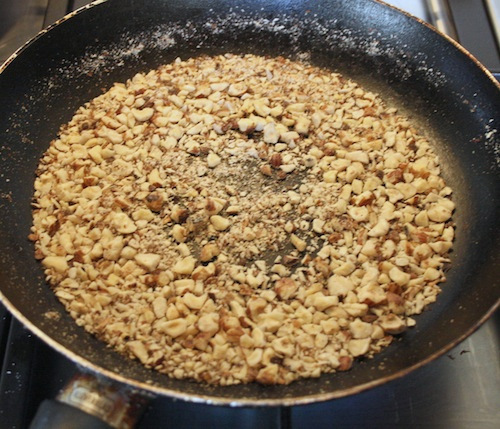 Rist nødderne på en tør panden (som på billedet), og sæt dem til afkøling.