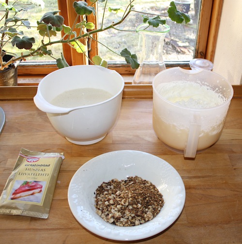 Bland nu kærnemælksblandingen, den piskede fløde og husblasblandingen og rør til sidst de ristede nødder i.
