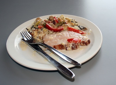 Champignon og peber fordeles over kødet. Fløde kommes ved sammen med 1 dl. chilisauce. Ost og forårsløg kommes ovenpå.