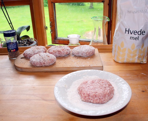 Form farsen til karbonader som på billedet. Vend i mel og krydr med salt og peber.
