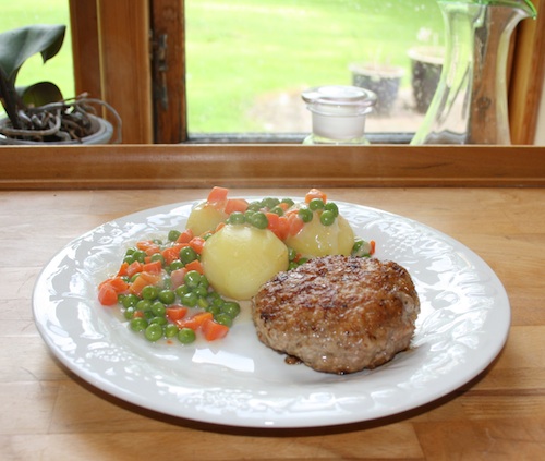 Gammeldags karbonader med kartofler og stuvede ærter og gulerødder
