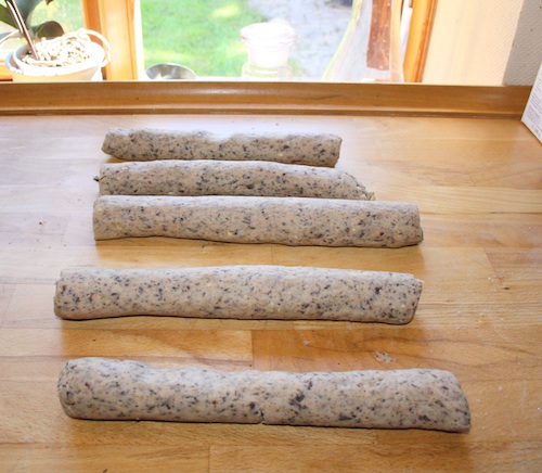 Specierne kan formes på 2 måder – enten ved at rulle dejen ud i pølser som på billedet og skære i tynde skiver som bages.