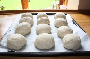 Sæt til hævning i en times tid. Når dejen er hævet slåes den ned og bollerne formes.