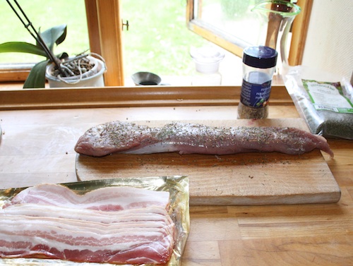 Mørbraderne drysses med peber og timian som på billedet og bacon vikles omkring.
