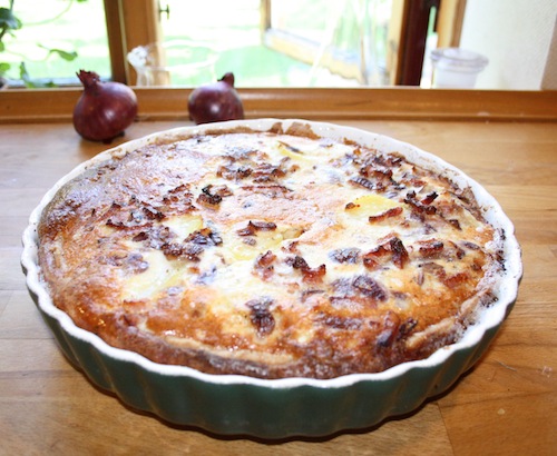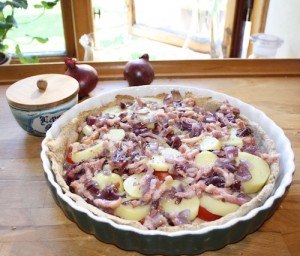 Lækker tomat-tærte med tomater, kartofler, løg og bacon – nok til ca. 6 pers.