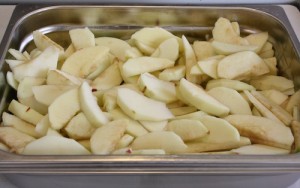 Æblerne skrælles og skæres i både og lægges i bradepanden. Rør de øvrige ingrediesner sammen og fordel ud over æblebådene.