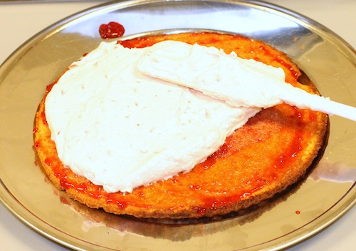 Kom ca. 2/3 af hindbærflødeskummet på den bund der lige er blevet smurt med marmelade og kom den anden bund ovenpå, som på billedet.
