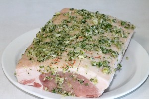 Steg ved 200 grader i ca. en time – kernetemperatur 75 grader – til den er mør.