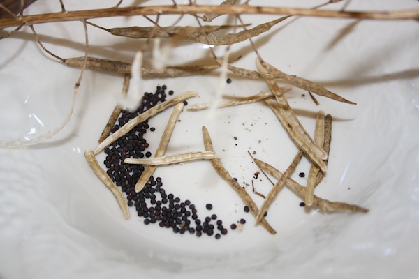 Når den er afblomsteret vokser bælgene (som på ærteplanter) ud og i slutningen af juli er frøene i bælgene modne. Planten får lov at visne næsten hen inden den høstes som på nedenstående billede.