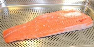 Laksen lægges på risten og krydres med salt – gerne en rigtig god salt som Læsø salt.