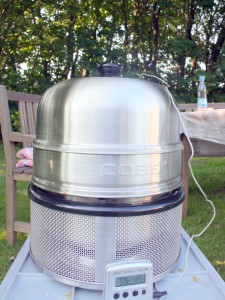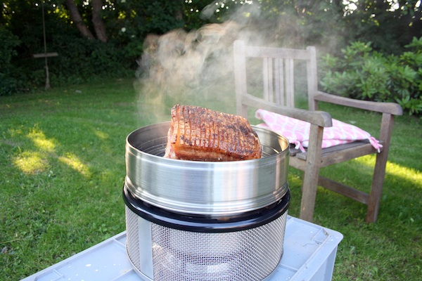 Stegen var lidt rigelig stor, så vi måtte komme et nyt stykke kul på men det gik meget smertefrit. Efter 3 1/2 time var stegen så færdigstegt og den var bare perfekt – sprød og saftig.