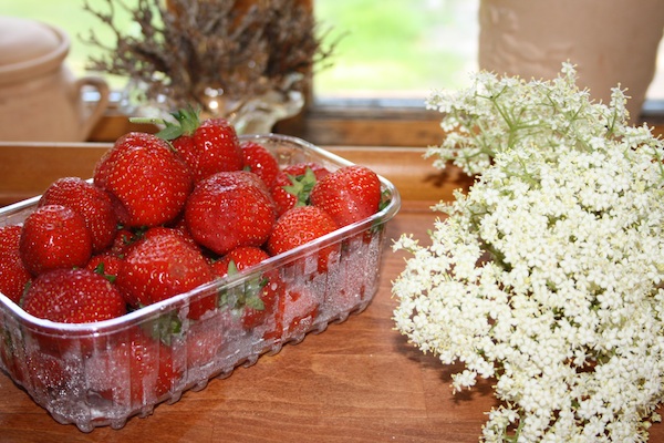Jordbærene får en rigtig lækker frisk smag, når der kommes hyldeblomster i marmeladen – man har lige 14 dage hvor der både er friske jordbær og hyld i blomst.