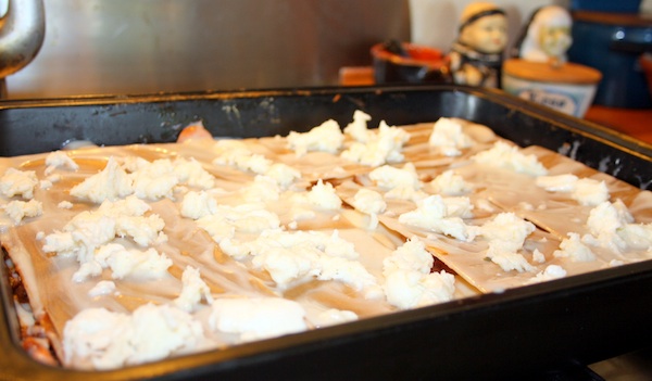 Kom derefter kødfyld og plader på skift og slut af med resten af Mornay saucen samt mozarella osten pillet i små stykker.