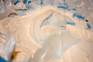 Når hele sukkerlagen er pisket i, piskes der i endnu 10 minutter, til massen er blevet meget mere stiv.