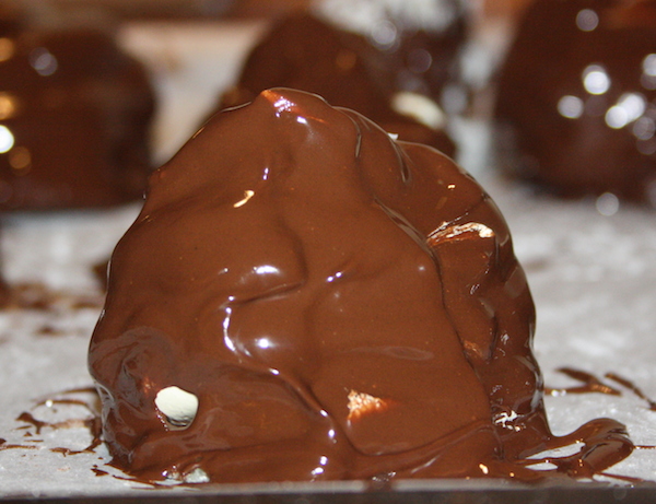 Med en kniv, spartel eller ske fordeles smeltet overtrækschokolade over flødebollerne og de er nu færdige.