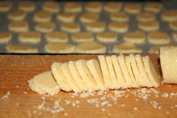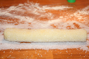 Sæt dejen i køleskab en halv times tid og form den så som pølser, som på billedet ovenfor.