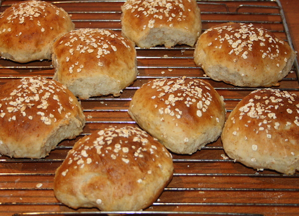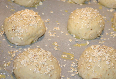 Efterhæv en halv times tid – pensl med æg og drys evt. med havregryn – og bag til de er dejlig brune som på nedenstående billede – ca. 15-20 minutter ved 200 grader.