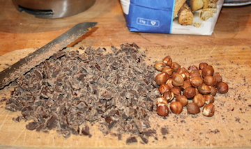 Tilsidst røres chokolade og nødder i og dejen er færdig.