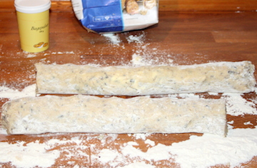 Rul dejen ud til 2 tykke pølser og rul dem ind i staniol – sæt i køleskab i mindst 2 timer, men dejen kan sagtens holde et par dage, hvis man ikke lige har tid.